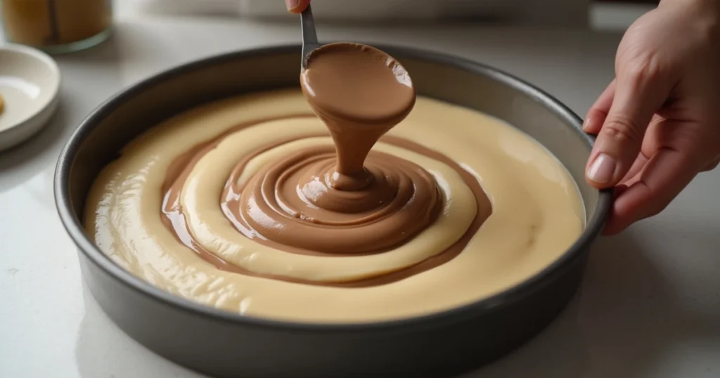 A close-up of a round cake pan with alternating scoops of vanilla and chocolate batter being poured into the center to create concentric rings